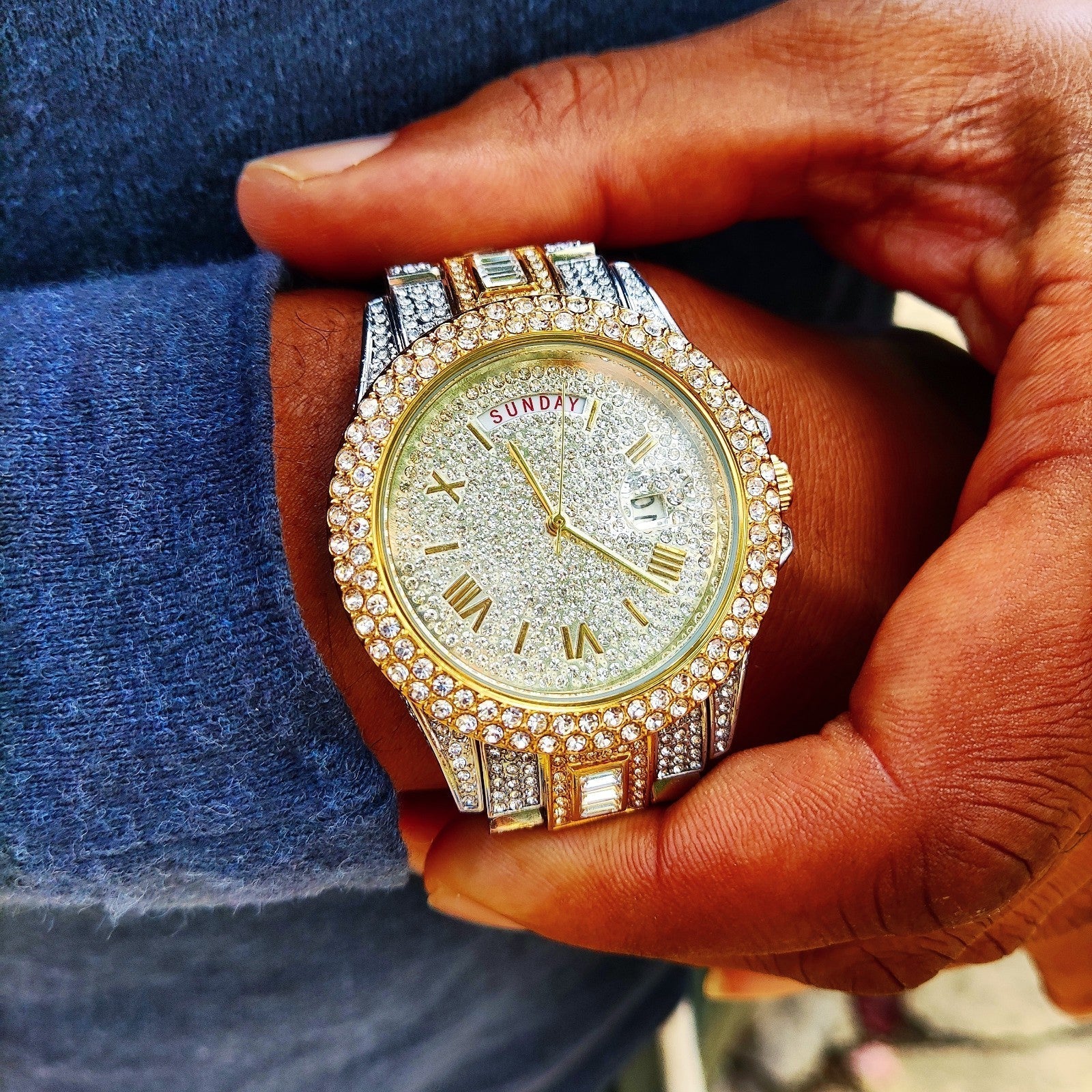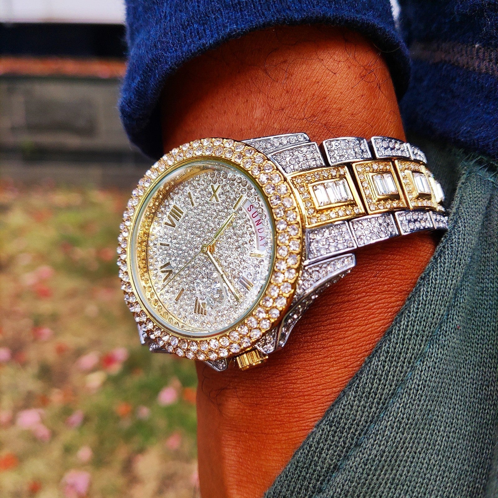 The 18K Gold Diamond Presidential Watch is made with high quality 18K Gold Plating dipped 7 times for a long lasting and durable shine. Each and every part of the watch is covered with stunng VVS CZ Diamonds.