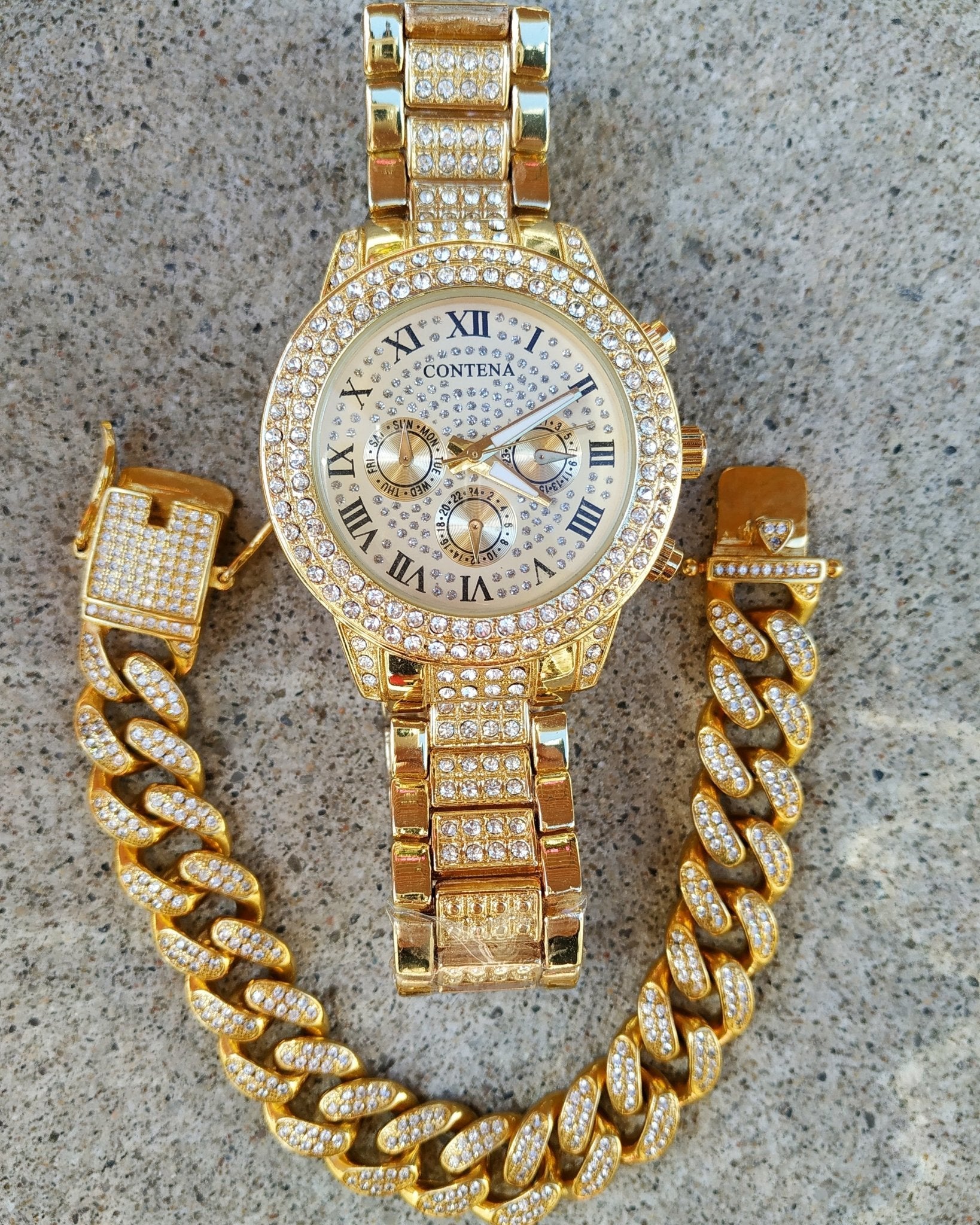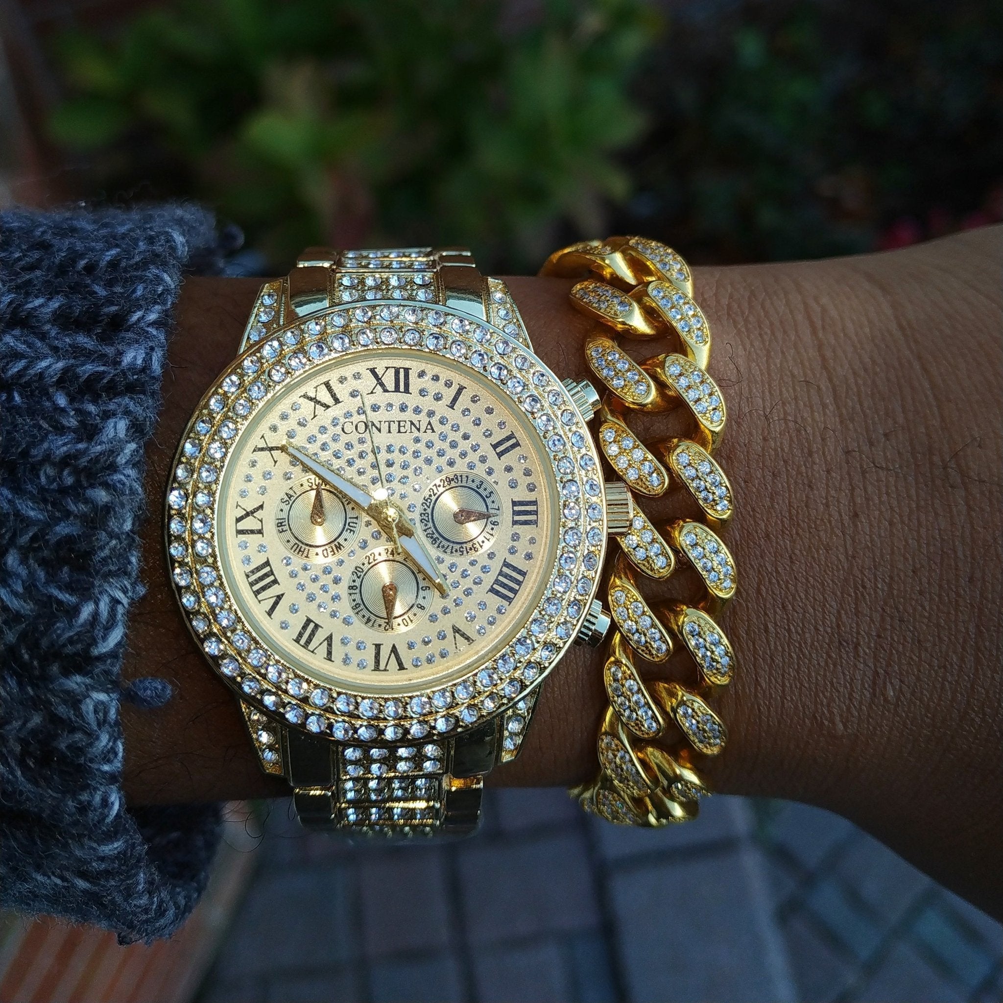 The Miami Double Bezel Watch and Bracelet Set is the perfect set to show off your style and fashion sense.The stylish Diamond Double Bezel Watch teamed up with the Diamond Miami Cuban Link Bracelet for an unforgettable duo.