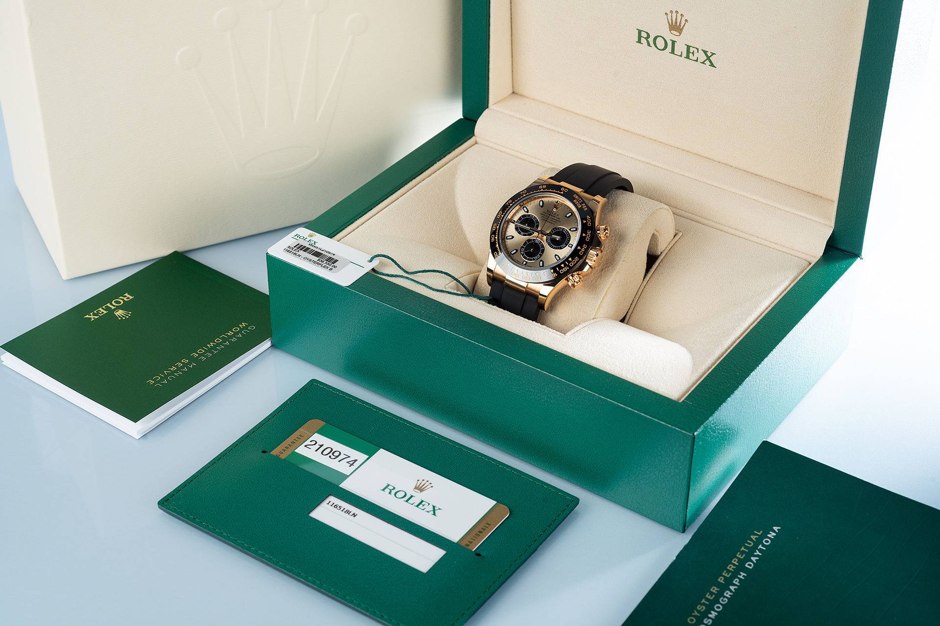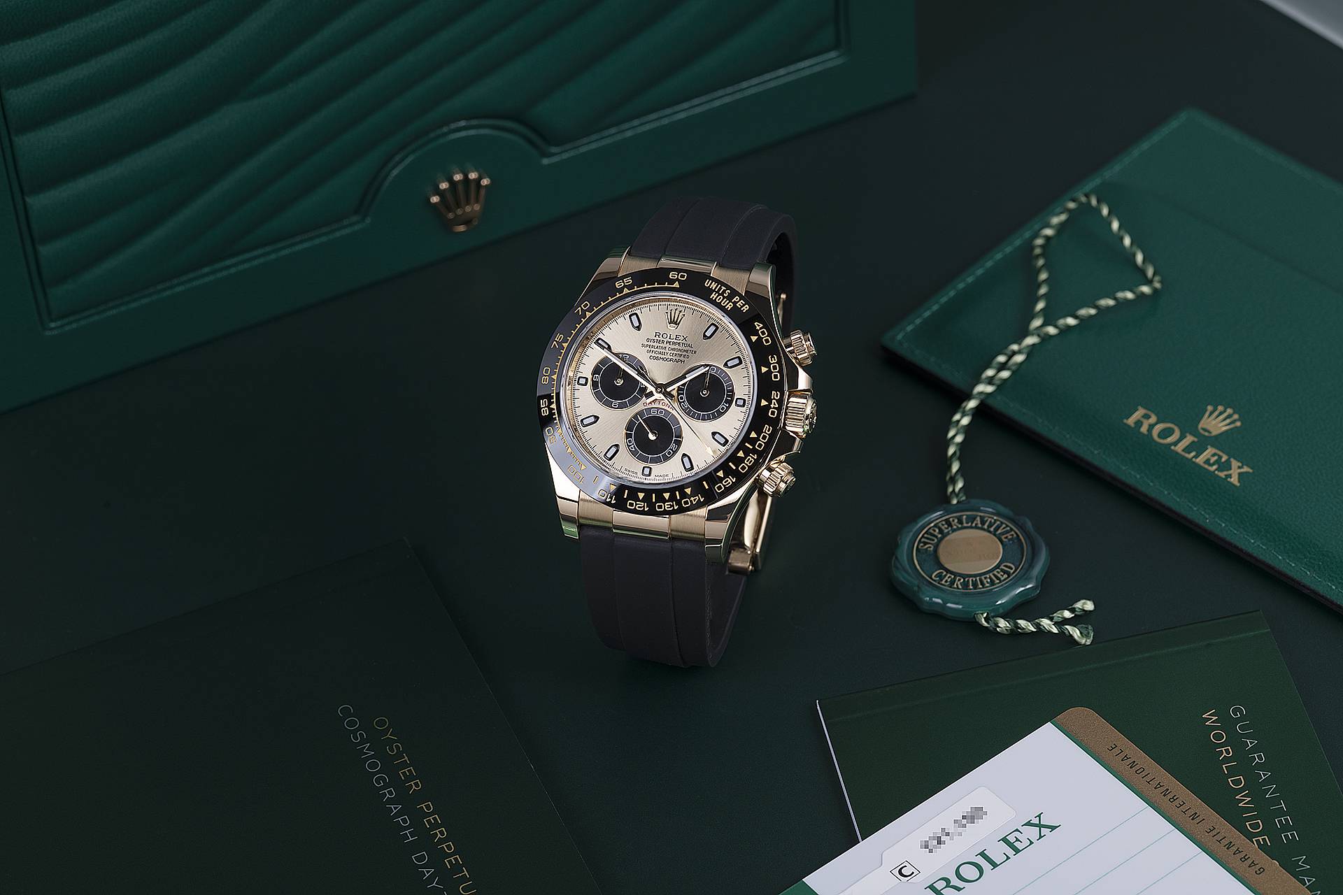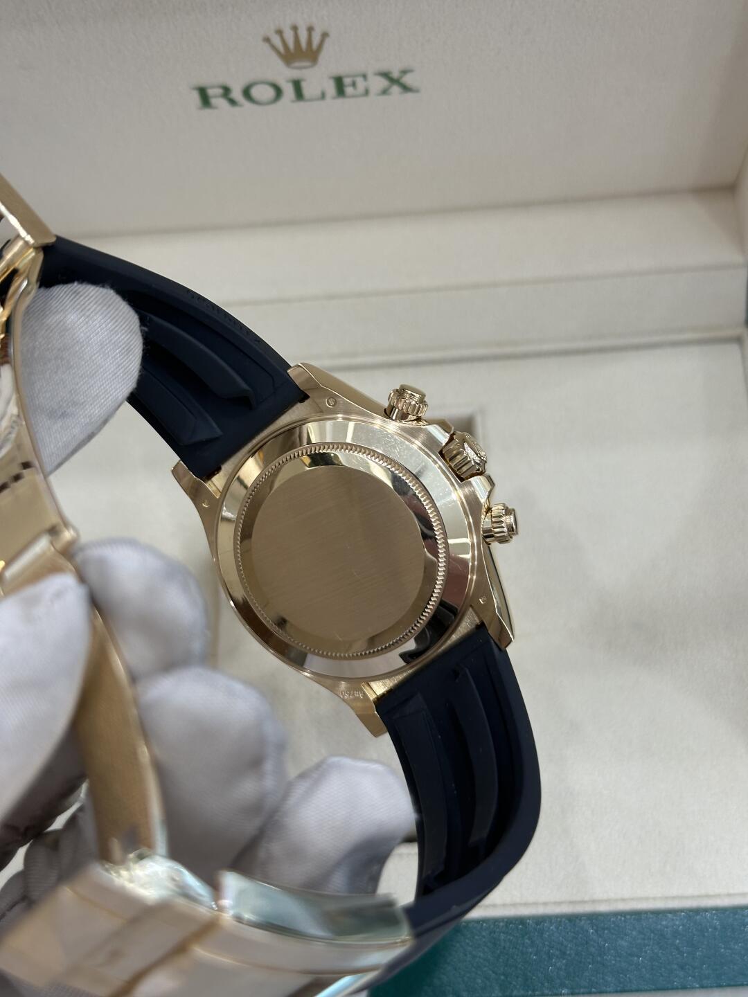 Rolex Daytona Cosmograph (116518LN) self - winding automatic watch, features a 40mm 18k yellow gold case with a black Cerachrom bezel surrounding a champagne dial on a black Oysterflex strap with a yellow gold deployant buckle.