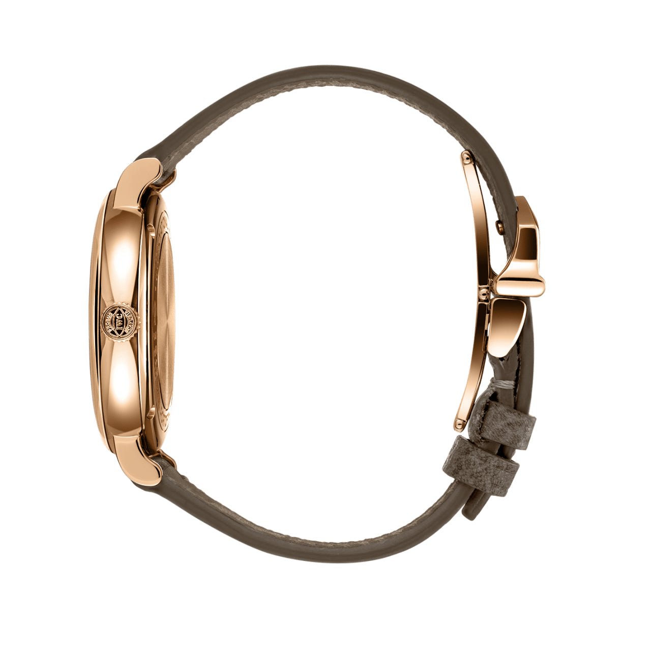 Highlights: The Portofino Automatic 34 (IW357414) features an 18-karat gold case with gold-plated hour markers, Roman numerals at 6 & 12 o’clock, and slender feuille hands providing a delightful contrast to the silver-pated dial, on which twelve bright white diamonds mark the hours. This casually elegant ladies’ watch is fitted with a taupe calfskin strap with a butterfly clasp. Thanks to the integrated quick-change system, the strap can be changed in no time, allowing the timepiece to be adapted to different outfits or situations.