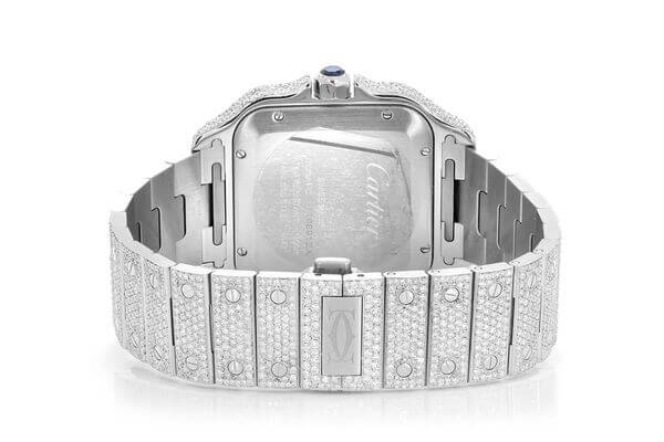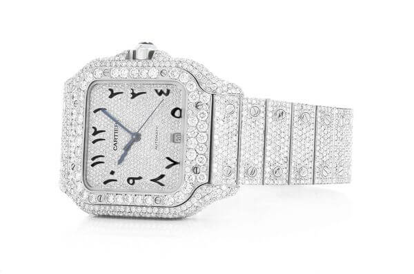 The Cartier Santos watch, renowned for its timeless elegance, has been elevated to new heights with a captivating iced out design.