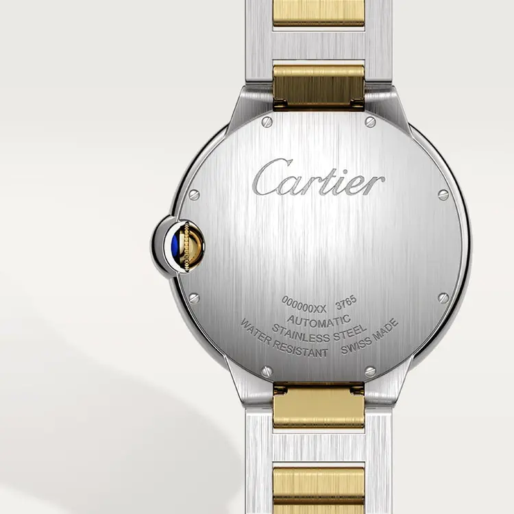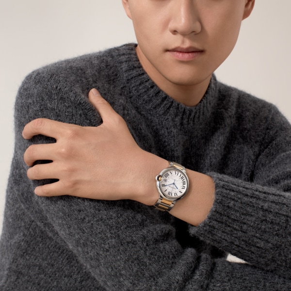 Ballon Bleu de Cartier watch, 42mm. Mechanical self-winding movement, caliber 1847 MC. Stainless steel case, 18K yellow gold (750/1000) fluted crown set with a synthetic spinel cabochon. Guilloché dial in silver-tone. Blued steel sword-shaped hands. Sapphire crystal. Date window at 3 o'clock. Two-tone interchangeable bracelets. Thickness: 13mm. Water-resistant to 3 bar (approx. 30 meters/100 feet).