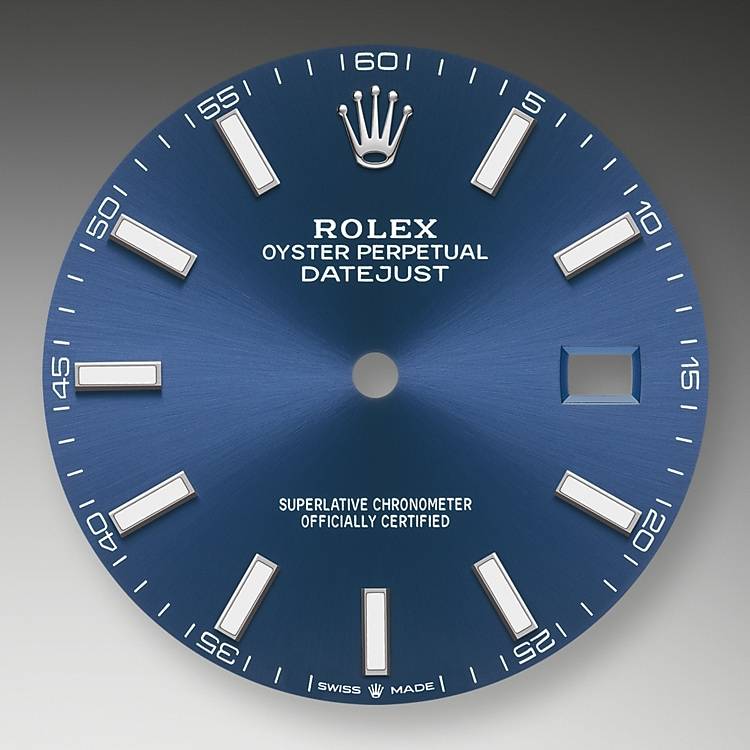 This Oyster Perpetual Datejust 41 in Oystersteel and white gold features a bright blue dial and an Oyster bracelet.