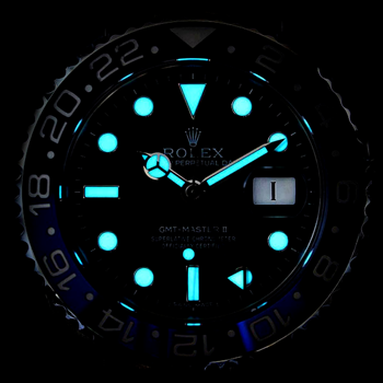 Rolex GMT-Master II Swiss Replica watches are equipped with the new SuperLuminova™ Blue glow luminescent pigment that after sufficient activation by sunlight or artificial light will glow in the dark up to 9 hours with uniform luminosity throughout.
