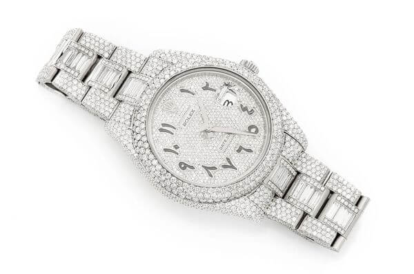 This ROLEX DATEJUST ICED OUT is made of Silver and 41mm with 23.50ctw of Moissanite diamonds.This watch inside and out to Rolex quality standards.