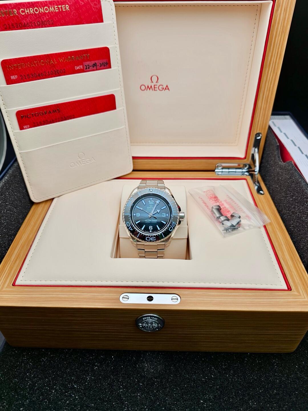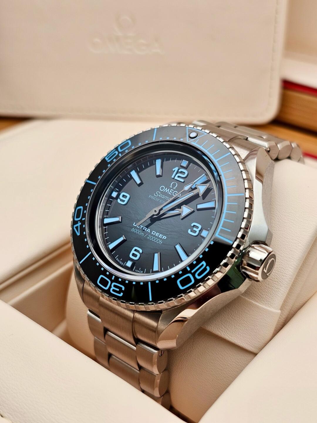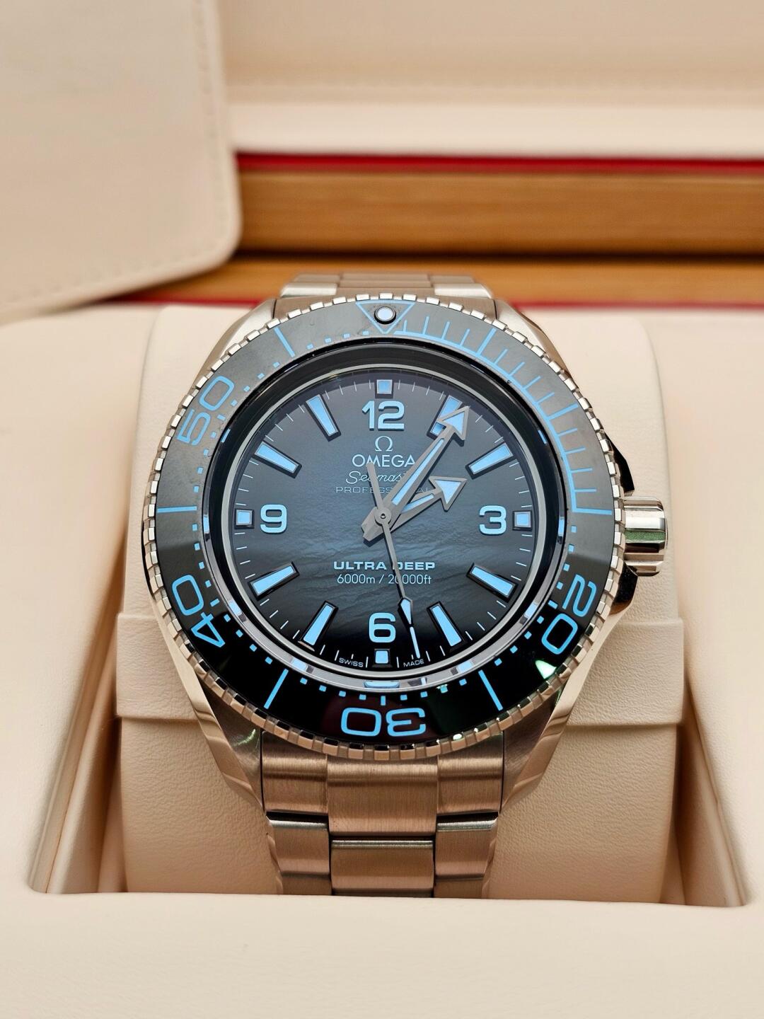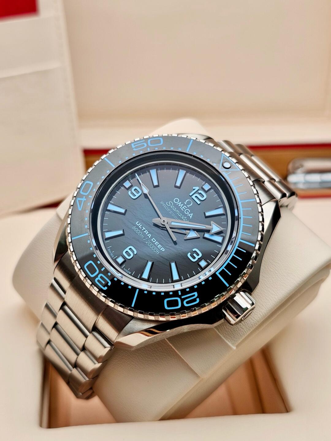 The case of this watch is 45.5 mm. The case and bracelet are made of O-MEGASTEEL stainless steel alloy developed by Omega, which is strong and durable. The unusual dial design pays homage to the deep sea. The dial pattern faithfully reproduces the scene at the bottom of the "Challenger" abyss of the Mariana Trench. This pattern was mapped by the "Five Ocean Deep Expedition" team using nearly one million sonar points. The paint treatment on the dial is like sea water flowing across the dial, presenting a unique and spectacular scene at the bottom of the ocean. The dial design also hides a mystery. When ultraviolet light shines on the dial, the words "OMEGA WAS HERE" pop up in front of you, indicating the 10,935-meter world record for deep diving created by the Ultra Deep prototype watch. In addition, the dial also shows the West Pond, the Middle Pond and the East Pond at the bottom of the Challenger Abyss, which is unique and interesting.