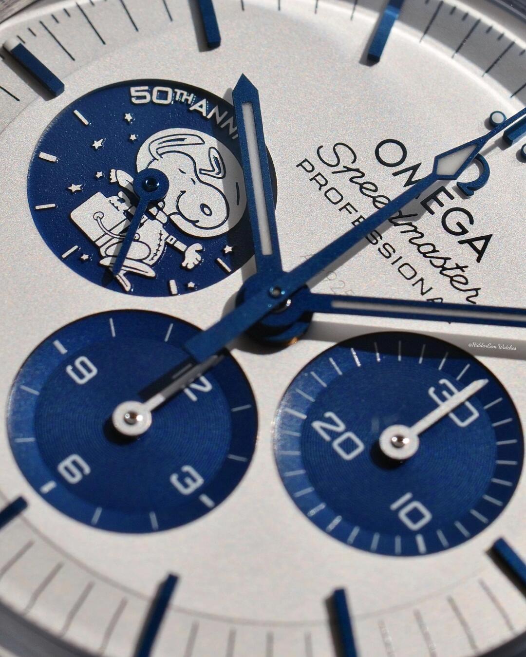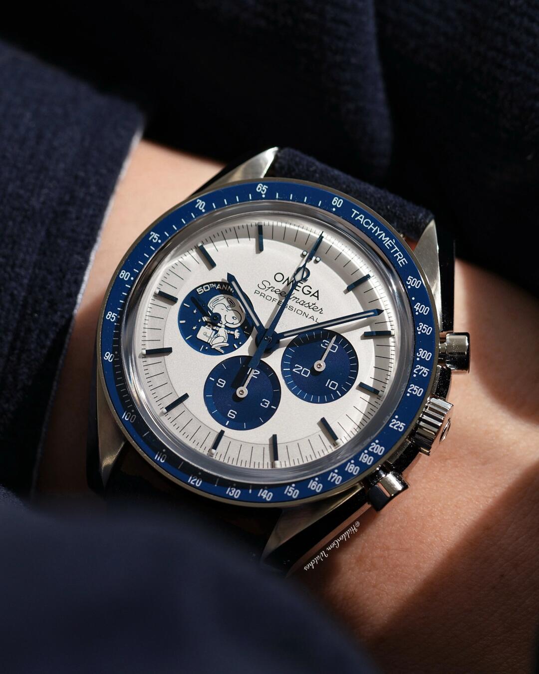 In order to commemorate the fact that its own moon watch successfully assisted the astronauts facing electronic equipment failure in the Apollo 13 mission and was awarded the Silver Snoopy Award by NASA, OMEGA launched the Speedmaster Snoopy watch in 2003 and 2015. Until recently, the brand finally released the latest 3rd generation Speedmaster series "Snoopy Silver Award" commemorative watch as everyone expected. The appearance of the new Speedmaster Snoopy commemorative watch continues the style of the previous generation, including the 42mm stainless steel case and the lower three-eye chronograph dial, etc., but the latest third-generation interpretation of the Snoopy medal pattern is still different from the predecessor; the pattern of the first generation is colorful, while the third generation has a white Snoopy medal pattern engraved on the blue small dial, and the words "50th Anniversary" are added above the pattern. In addition, if you look closely at the 12 o'clock position on the dial near the pointer, Omega has written the words " Ag925 " in an intaglio manner, indicating that the dial is made of silver, which slightly echoes the story of NASA's Silver Snoopy Award.