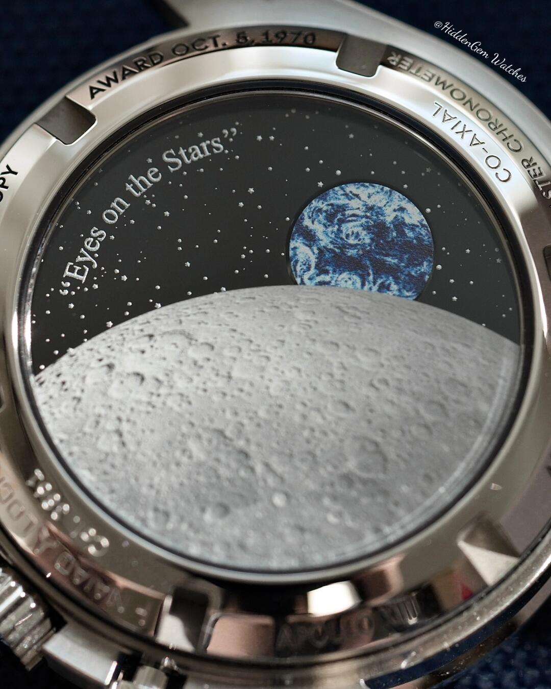 A feature of the first two generations of Speedmaster Snoopy watches is that the viewability of the case back is no less than that of the dial, but they are all static images. With the third generation, Omega has a new idea - and it is a dynamic expression. When you turn to the back of the third generation watch, you will be surprised to find the moon in the foreground and the earth in the background, plus the starry universe around it, and there is also Snoopy in a flight suit sitting on a space shuttle. The moon is made using a unique microstructure metallization technology and is decorated on the back of the sapphire crystal case. In addition, the earth pattern is not just a decoration. In fact, it moves with the small second hand on the dial, rotating once a minute. Also moving is Snoopy sitting on the space shuttle. Once the wearer starts the chronograph function, the Snoopy pattern will rotate counterclockwise and even disappear under the moon in the middle. It will reappear at about five o'clock, as if running along the orbit.
