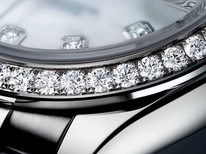 Non scratch real Sapphire crystal is use on all our Swiss Replica watches. Been one of the hardest substances on earth it's virtually impossible to scratch unlike mineral glass found other replicas. Real Moissanite diamond gem is hand-faceted by our gem cutters to offer the same brilliance and spark found on the genuine watches. We guarantee that your Swiss replica watch diamonds brilliance will last forever.